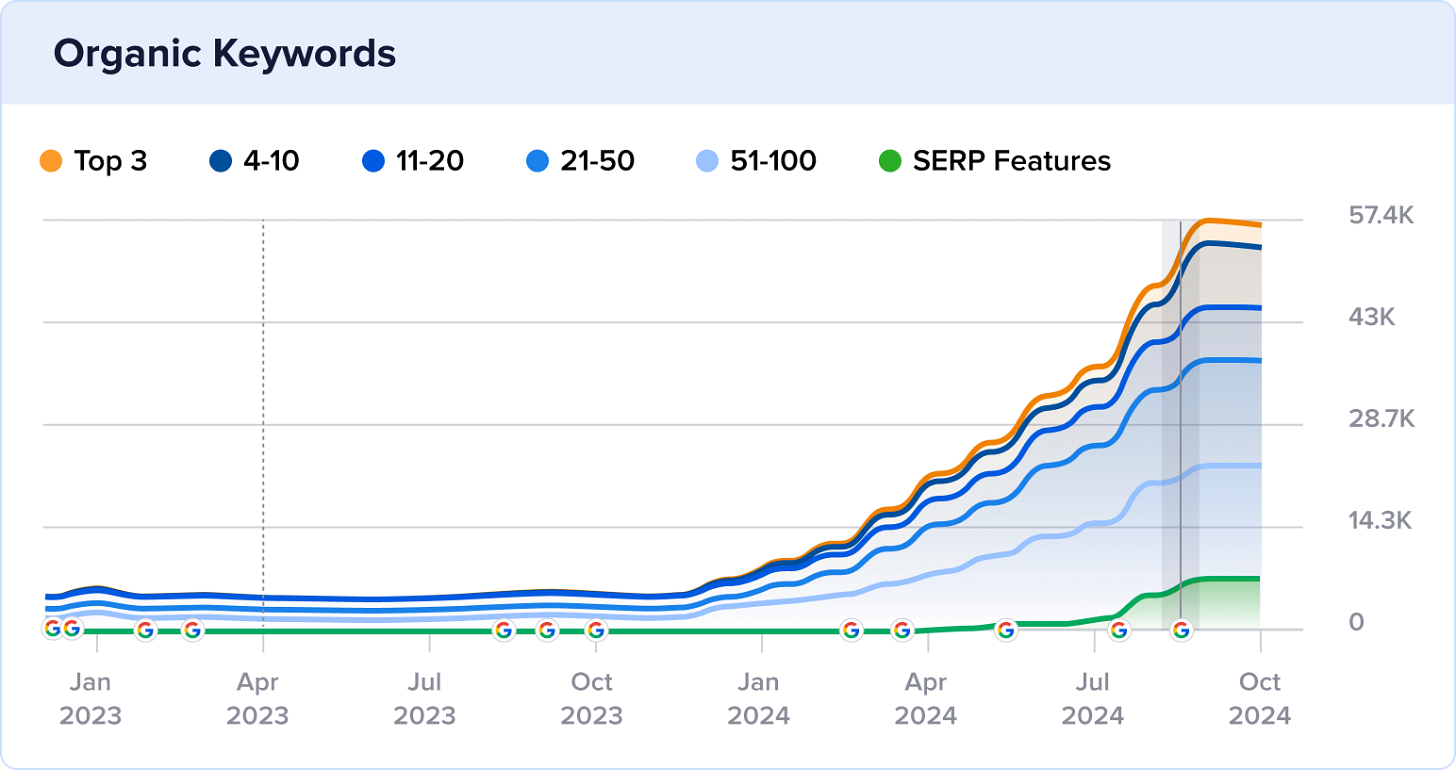 +57K mots-clés positionnés (vs. 4,7K l’année précédente).